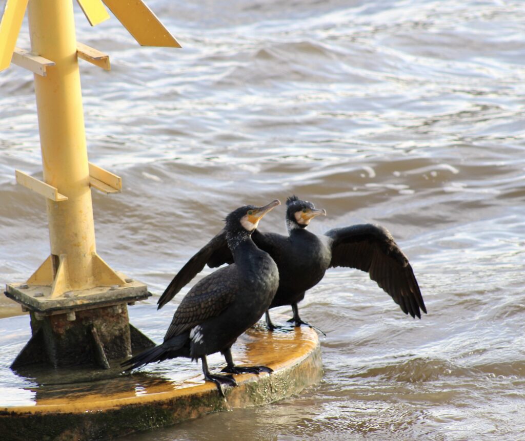Cormorants can often be seen skimming low over Thames waters, and from time to time seen standing on rocks, piers and even the yellow Palace of Westminster markers, stretching out their wings.
