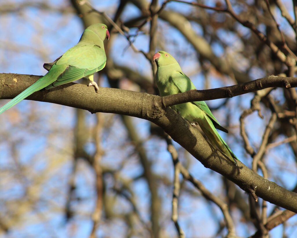 Over and above the harsh cawing of crows and chattering magpies, the screeching of ring-necked parakeets is unmistakable. However, they do have more gentle billing and cooing sounds in their lexicon too.