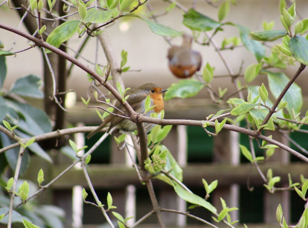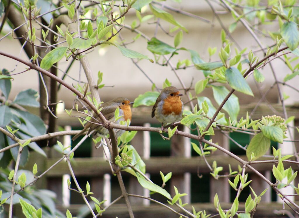 Though I’ve often seen two robins in a territorial scrap, I haven’t often seen a pair of robins as a couple. Robins are one of only a few British birds that sing throughout the year and there was some singing going on here. Warning notes…