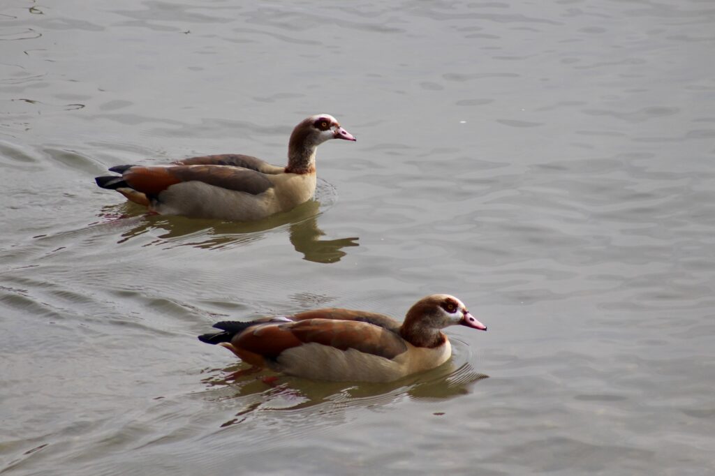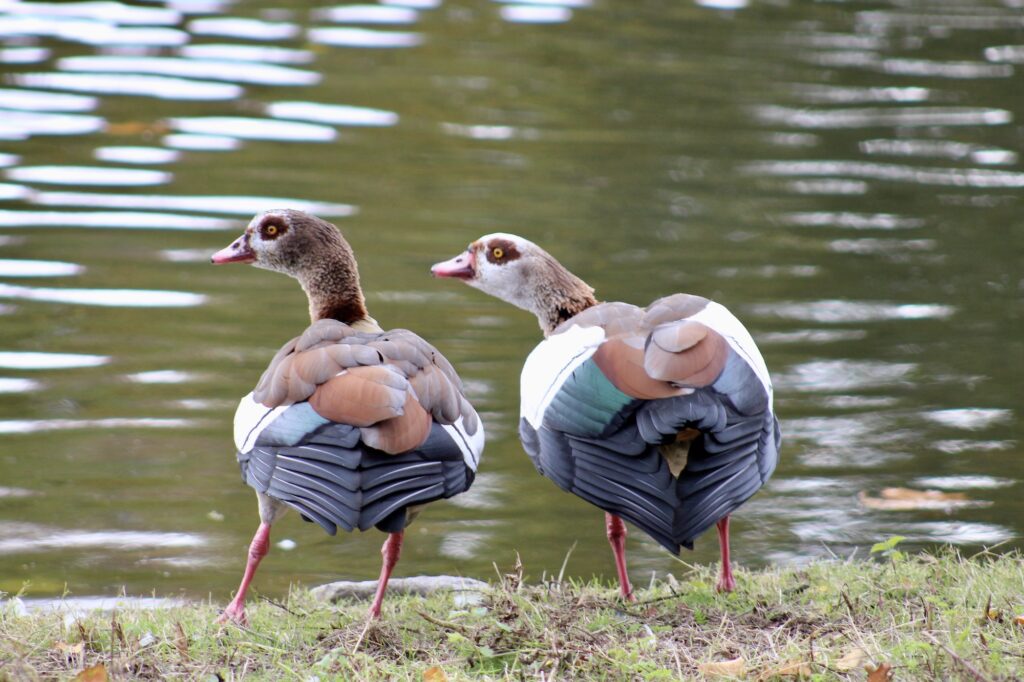 On the day I photographed this pair, they were attracted by a noise from other Egyptian geese honking further along the lake shore in St. James’s Park. The brown circles round their eyes give them a comical, quizzical look.